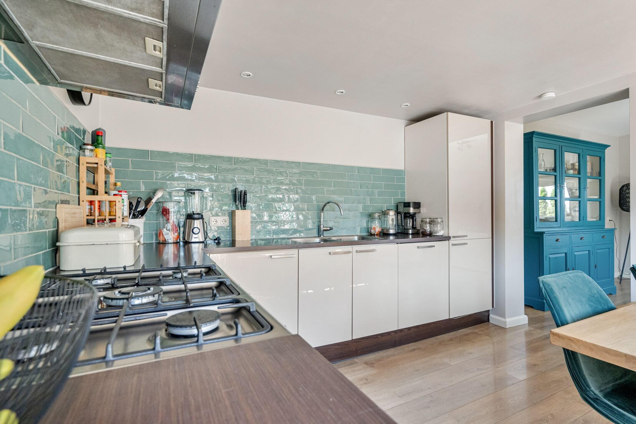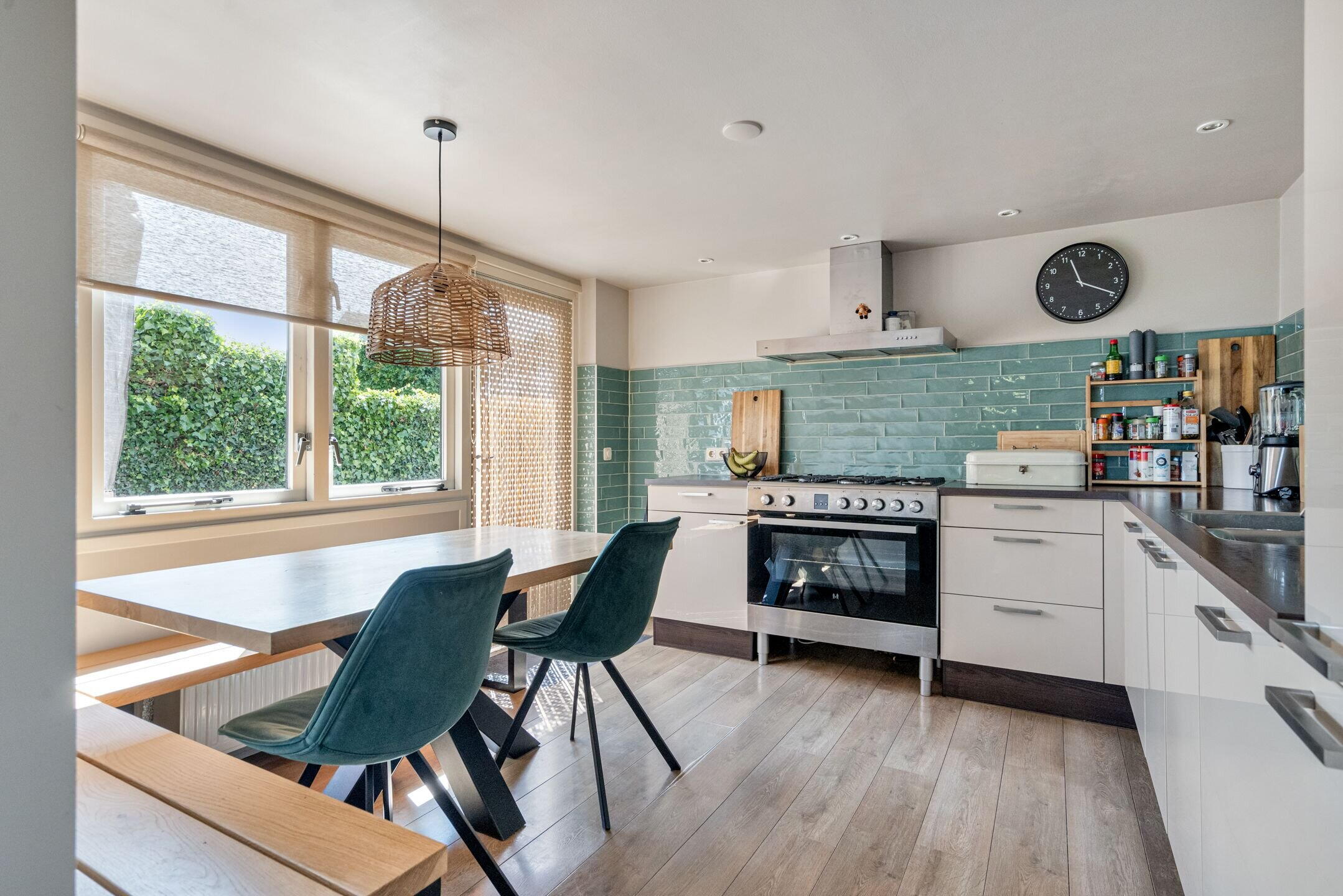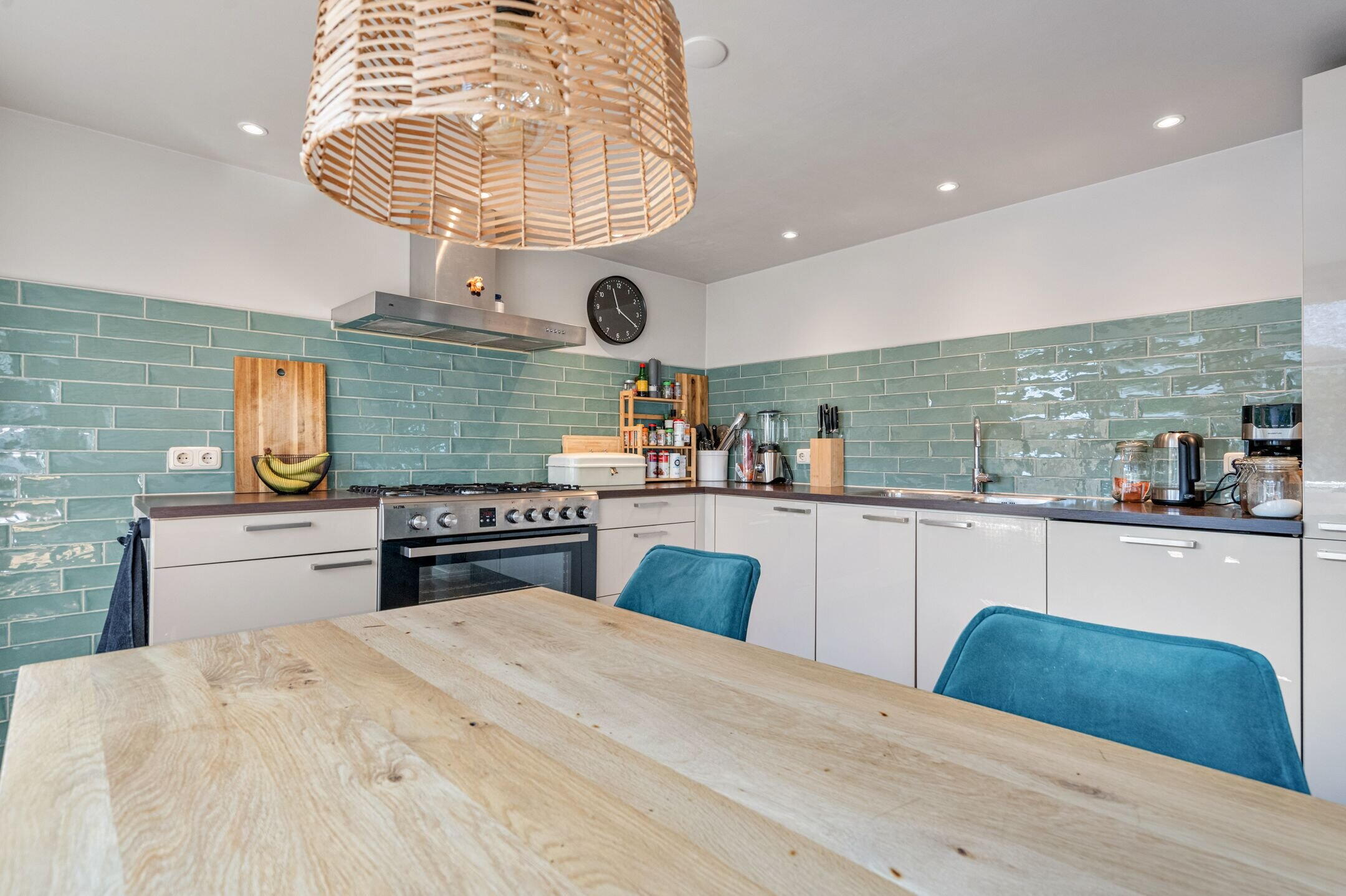 Aan de achterzijde is de woning uitgebouwd met een moderne woonkeuken in hoekopstelling. De keuken is uitgerust met een vrijstaand 5-pits fornuis met oven en diverse inbouwapparatuur, waaronder een vaatwasser, koelkast, vriezer en wasemkap. Er is veel opbergruimte en voldoende plaats voor een gezellige eethoek. Via de achterdeur in de keuken is de tuin bereikbaar.