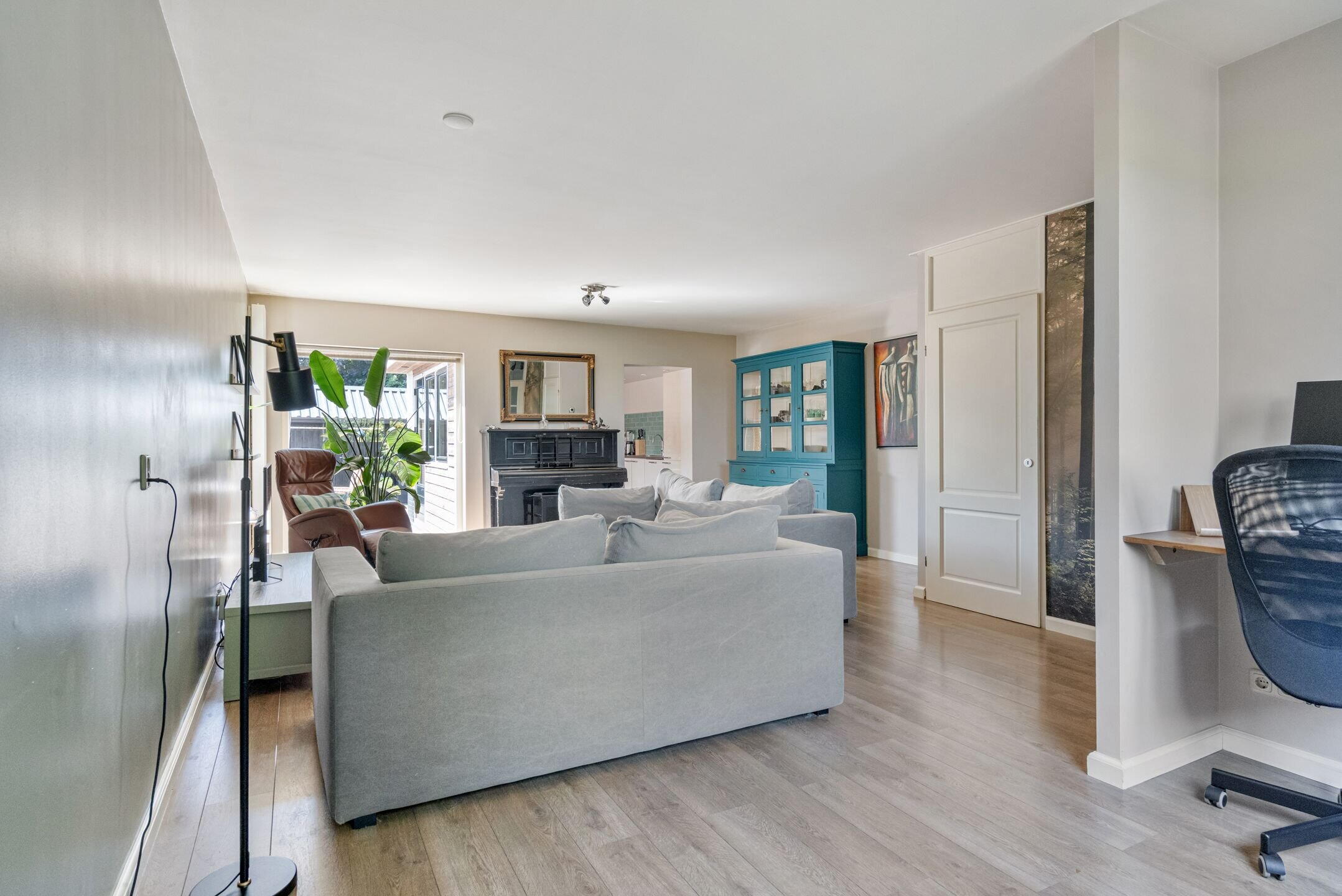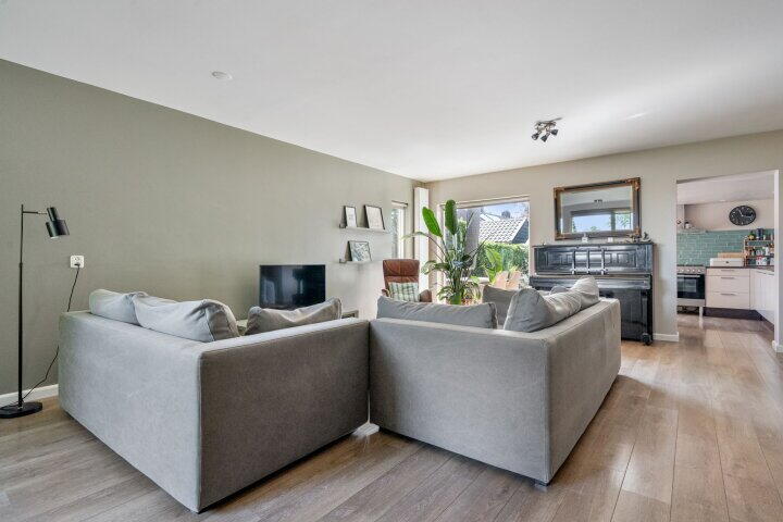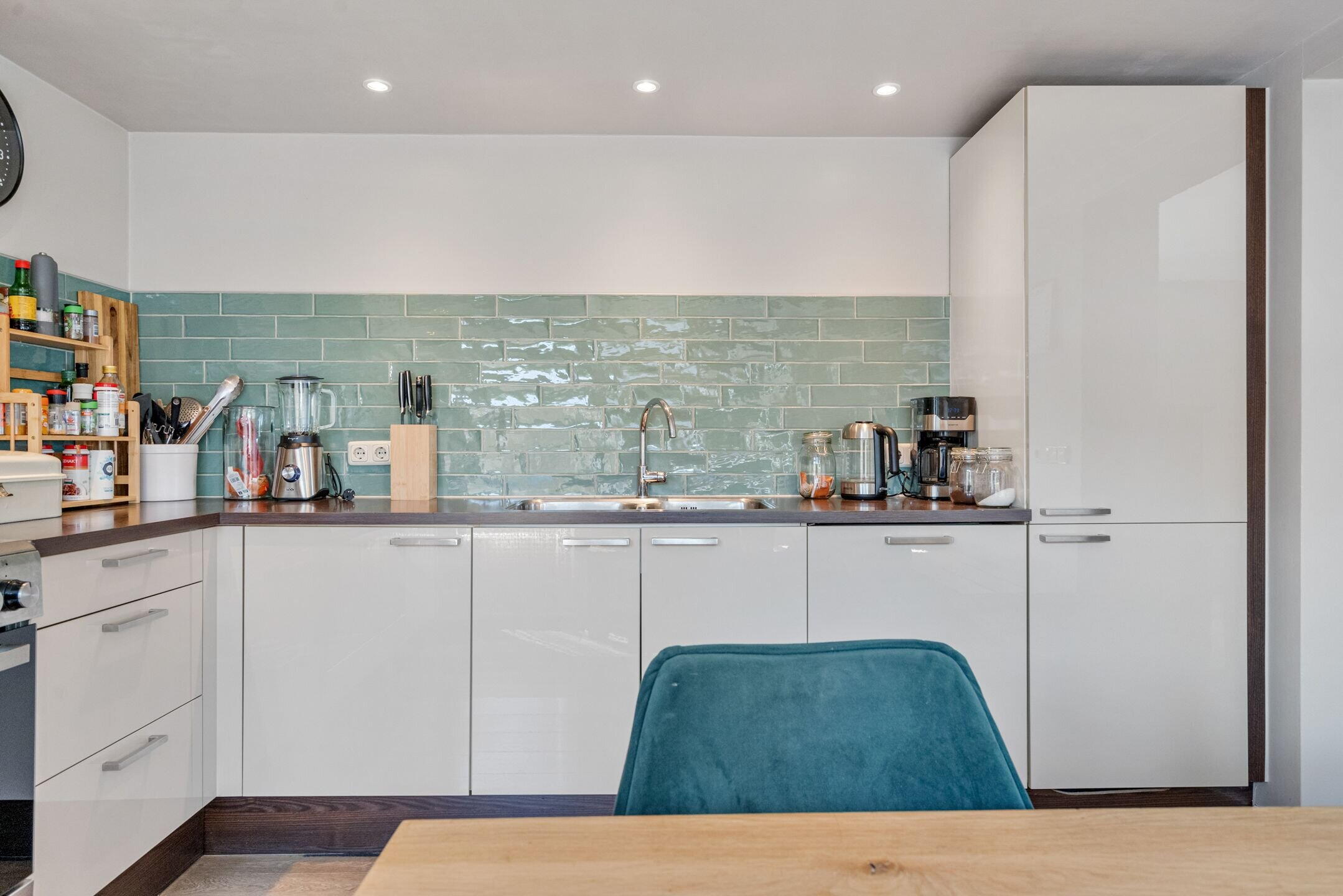 Aan de achterzijde is de woning uitgebouwd met een moderne woonkeuken in hoekopstelling. De keuken is uitgerust met een vrijstaand 5-pits fornuis met oven en diverse inbouwapparatuur, waaronder een vaatwasser, koelkast, vriezer en wasemkap. Er is veel opbergruimte en voldoende plaats voor een gezellige eethoek. Via de achterdeur in de keuken is de tuin bereikbaar.