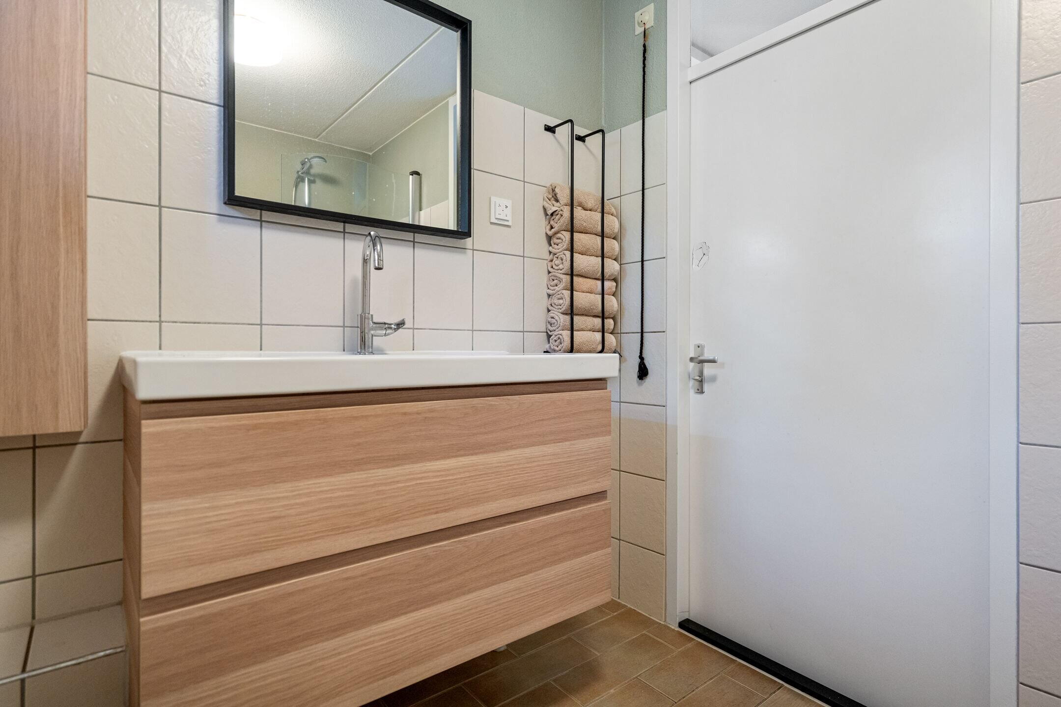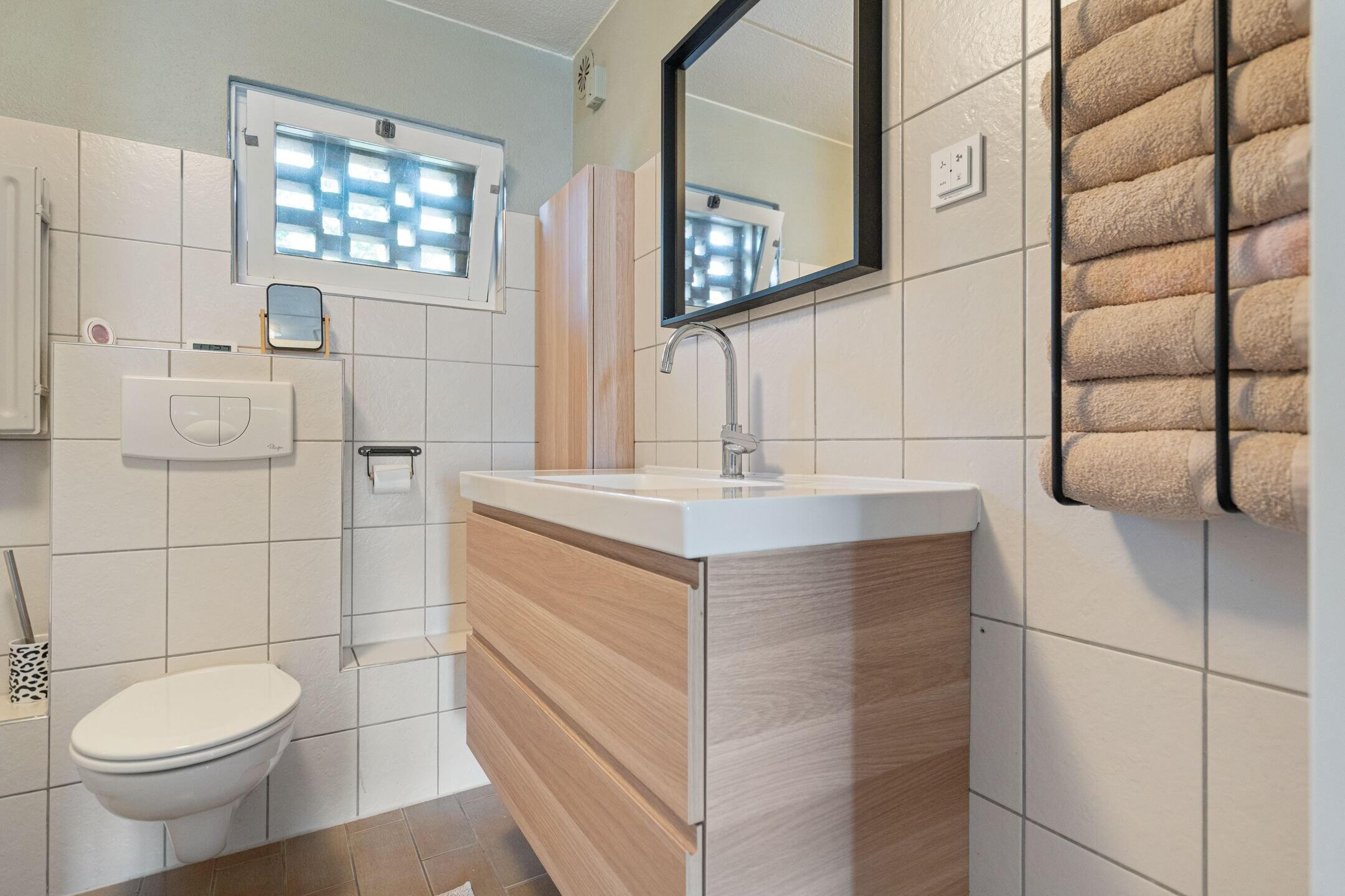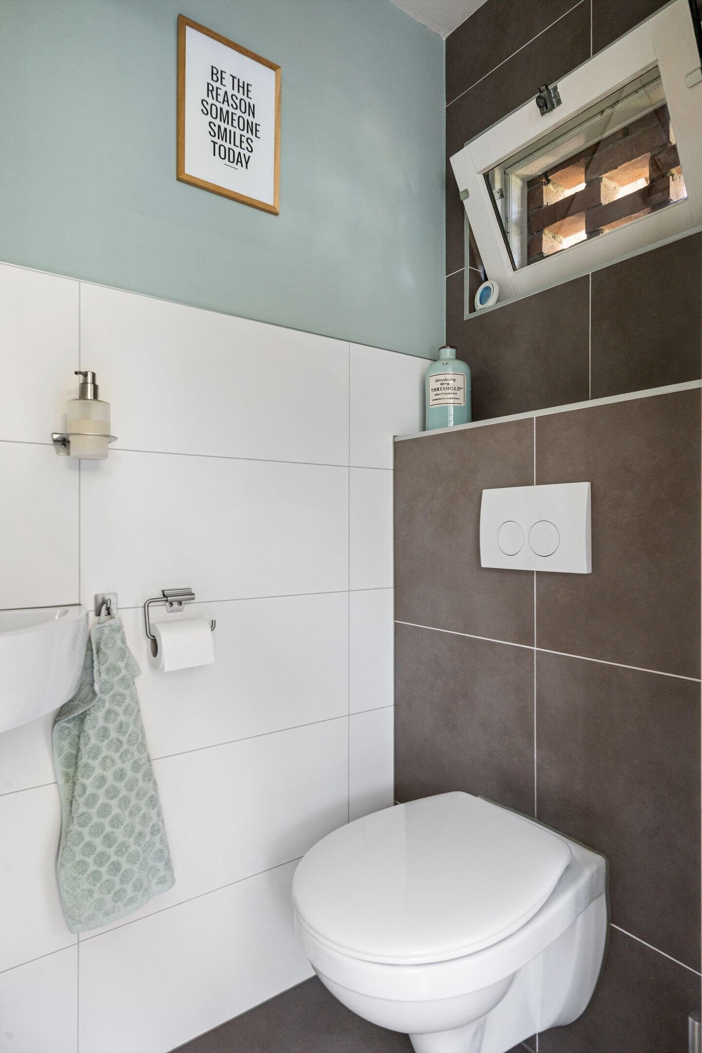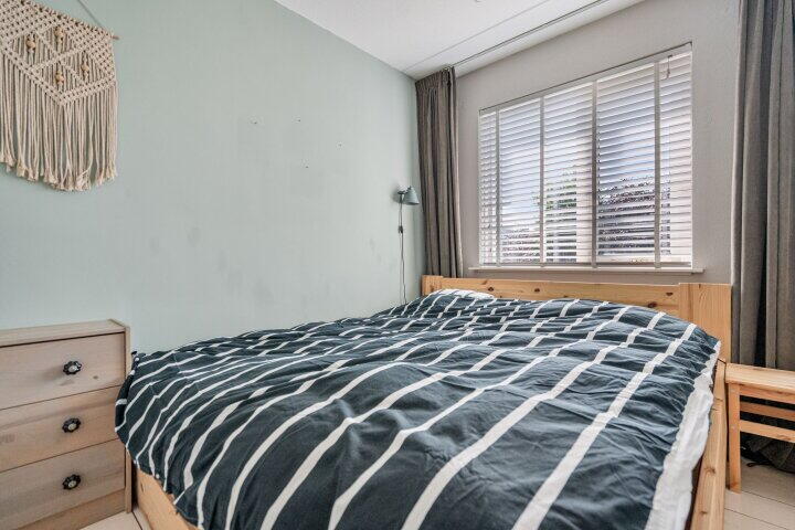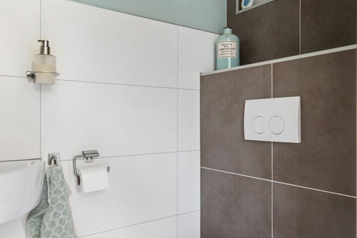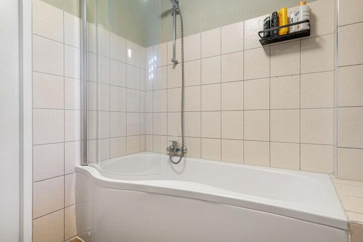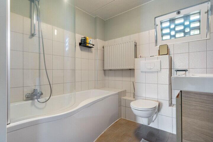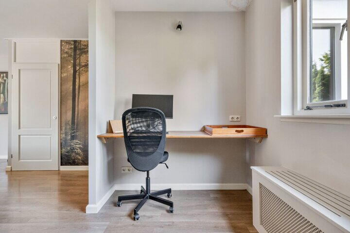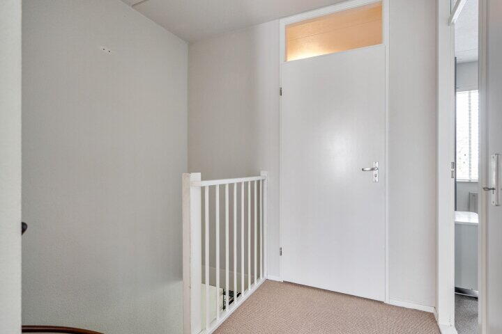 De overloop biedt toegang tot drie slaapkamers en een verzorgde badkamer in een lichte kleurstelling. De badkamer is compleet uitgerust met een ligbad inclusief douche, een modern wastafelmeubel en een tweede toilet. Praktisch zijn ook de vaste kasten op de overloop, ideaal voor extra opbergruimte. De slaapkamer aan de achterzijde, evenals de trapopgang naar de tweede verdieping, zijn bereikbaar via de slaapkamer aan de voorzijde.