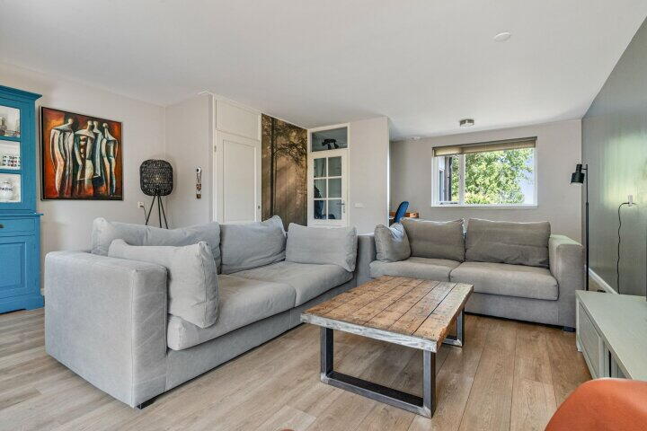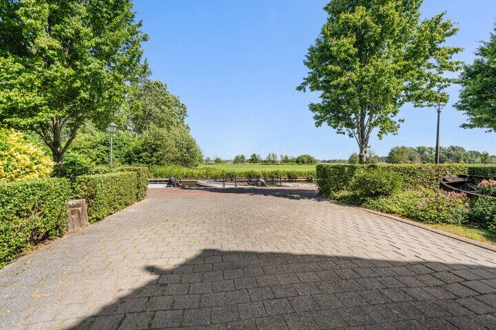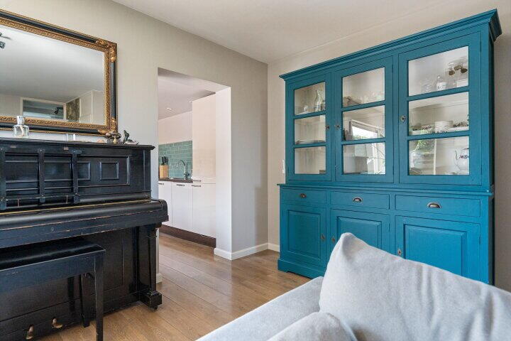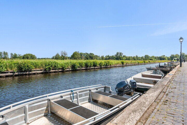 Entree/hal met meterkast, trapopgang en toiletruimte met wandcloset en fontein. De woning beschikt over een ruime, tuingerichte woonkamer met praktische trapkast en een vergroot raam aan de achterzijde, waardoor je mooi zicht hebt op de diepe achtertuin. Aan de voorzijde geniet je van een vrij uitzicht over de weilanden, het water en de voorbijvarende bootjes.